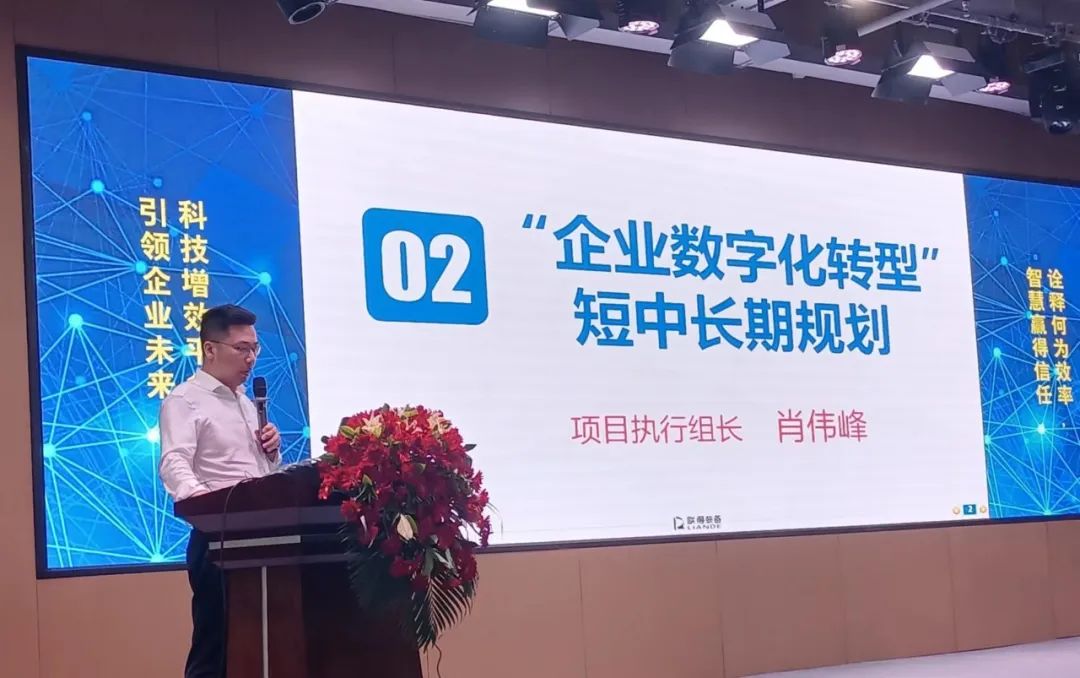 首先,总经办(数字化中心)总监肖伟峰宣讲联得装备数字化转型的短中长期规划。他提出,公司将从“人、系统、流程”三个维度齐抓共管,通过3-5年持续数字化建设,探索出一整套适合企业生产和运营管理的模式,稳扎稳打实现数字化转型,进一步做大产能,大幅提升企业核心竞争力。